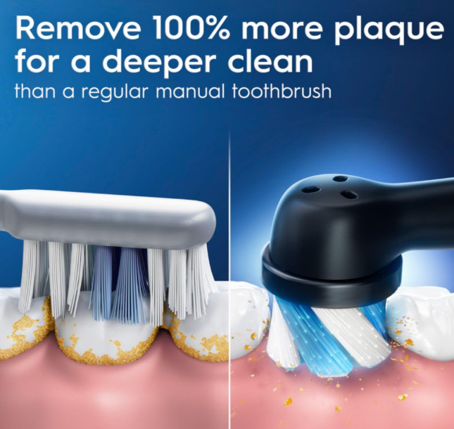 This toothbrush removes up to 100% more plaque than a manual toothbrush, thanks to the precision-engineered oscillating-rotating movements combined with gentle micro-vibrations. The unique round brush head reaches deep along the gumline, effectively lifting and sweeping away plaque for a noticeably cleaner mouth.