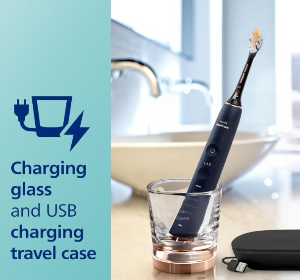 The DiamondClean Smart 9700 stands out immediately with its sleek, minimalist design. The matte finish gives it a premium feel, and the weighted handle feels balanced in hand. The iconic glass charging cup doubles as a mouth rinse glass—a hallmark of Philips design innovation.